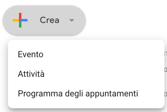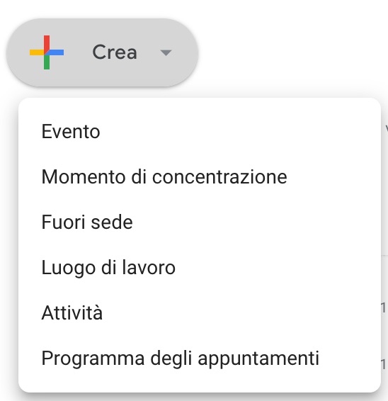 Sulla versione mobile dell’app di Google Calendar (se decidi di utilizzare questo strumento, io ti consiglio di scaricare l’app originale, perché funziona meglio dei vari calendari del telefono, es. Calendario di iPhone) non li trovi tutti ma solo quattro: Evento, Attività, Luogo di lavoro e Fuori sede.