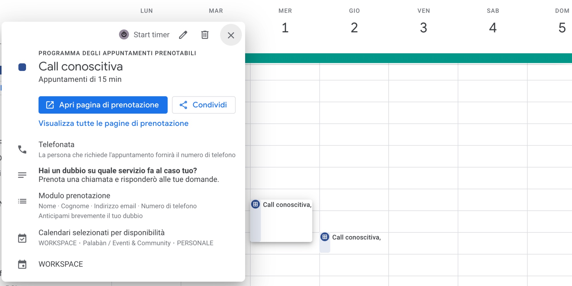 Questa funzione ha di fatto (potenzialmente) sostituito l’utilizzo di applicazioni terze come Calendly per l’organizzazione di appuntamenti (che ha comunque ancora senso se le tipologie di evento da prenotare sono diversificate). Si utilizza per mettere a disposizione di altre persone degli slot di tempo dal nostro calendario per poter prenotare un incontro, una telefonata o una consulenza con noi.