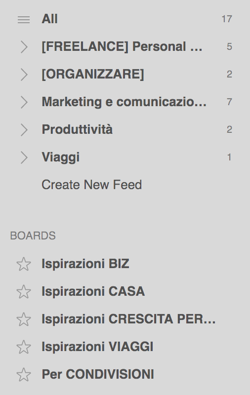 La raccolta delle informazioni di contenuti dinamici quali sono, per esempio, i blog post è sicuramente più efficace grazie all’utilizzo di un RSS reader, all’interno del quale è possibile selezionare le fonti, organizzarle in raccolte tematiche (per es. tutte quelle che parlano di time management) e sfogliarle periodicamente selezionando i post di tuo interesse per una lettura successiva. Di aggregatori ce ne sono diversi: io utilizzo Feedly.